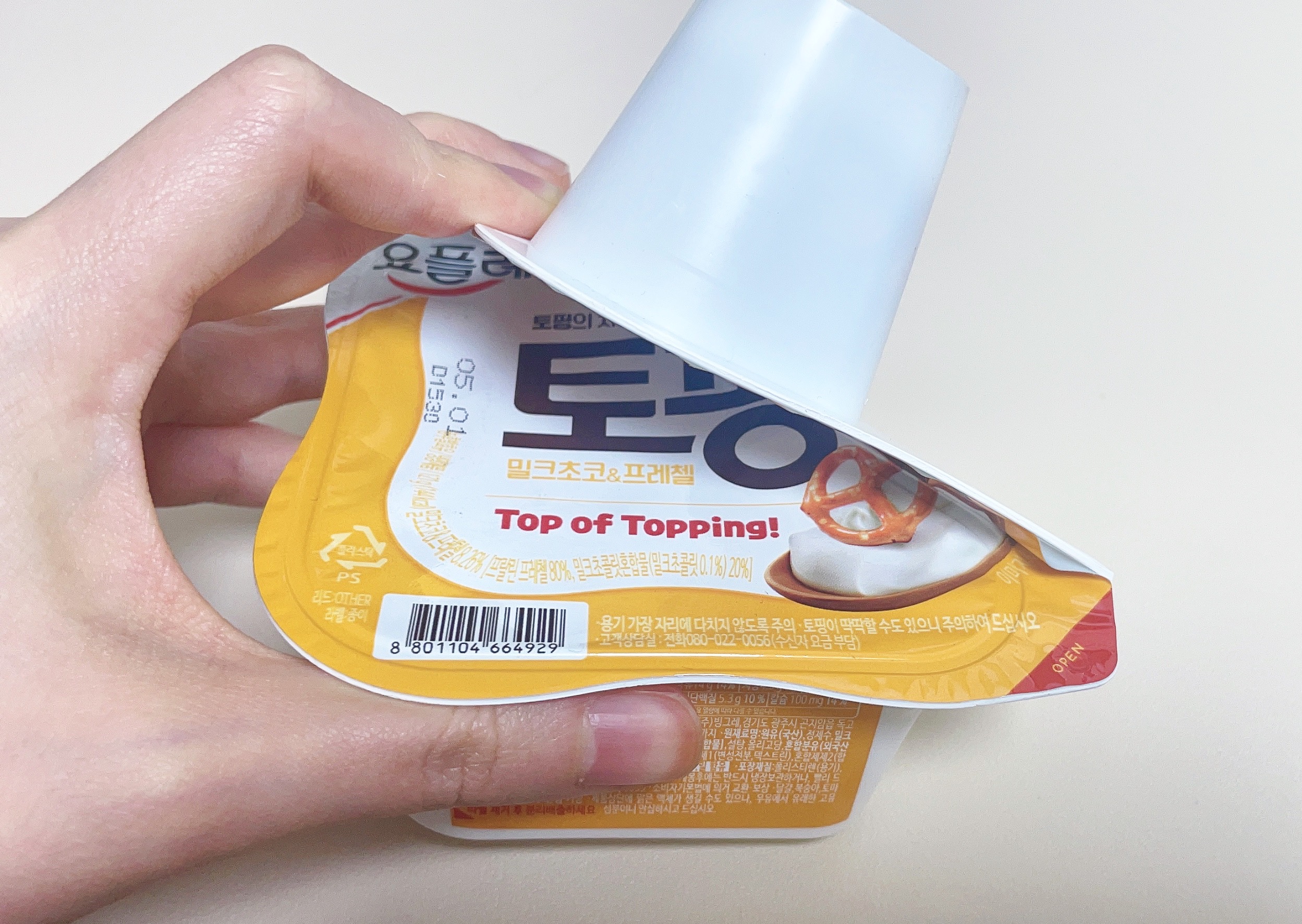희한하게 제품명이랑 패키지에는 <요플레 토핑 밀크초코&프레첼>라고 쓰여있는데